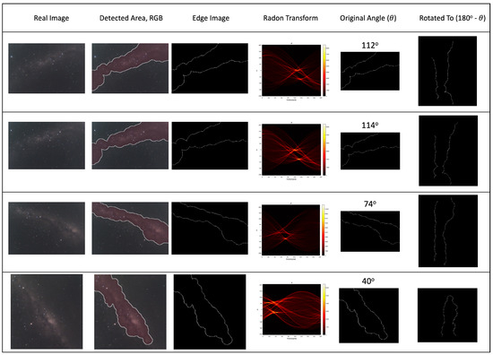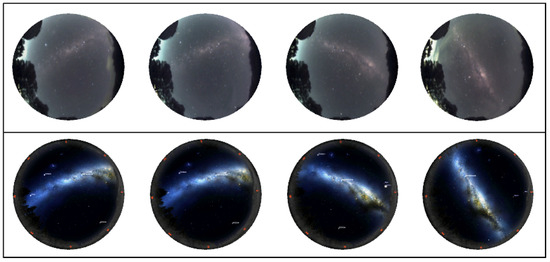 The algorithm was tested on both simulated images and real night sky images. The Bortle scale levels selected for the simulated images that were used for the processing set were 3 and 4. MW brightness and saturation are set as default (brightness: 1, saturation: 1). The simulated test image results can be seen in Figure 14; the first column provides a brighter and more clear MW shape (brightness: 5), which can be used for comparison between the Stellarium MW area and the detected MW area. The real images we used are from a live sky camera located at Mount Burnett Observatory, Australia [46]. Some additional information is provided about the camera in Table 3. In order to illustrate the MW shape clearly, Figure 15 shows the MW area with increased brightness (Stellarium MW brightness set as 5).