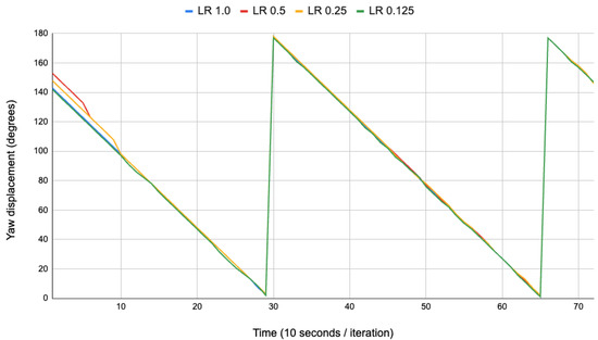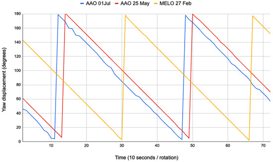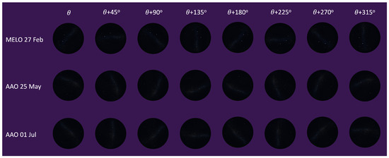 The intent of the algorithm is to simulate the use of the MW as a celestial direction reference. The algorithm was executed on simulation images that resulted from the observer undergoing a continuous rotation rate of 0.5°/s with updates at 10 s intervals, imposing both a rotation and the gradual movement of the celestial hemisphere and MW over time. All the dates and times for this test are set on different moonless nights. Figure 17 shows a small subset of the test images from Stellarium for illustrative purposes: The images were captured from angle to , at 45° intervals. All of the images that were used for this angle calculation test were under LP:4 conditions (MW brightness: 1 and saturation: 1). The rotation angle calculation results for three times and locations are plotted in Figure 18.