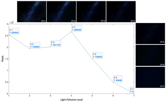 As we can see from Table 1, different light pollution levels represent different naked-eye limiting magnitude (NELM). For example, level 3 corresponds to the rural night sky where the NELM is 6.6–7.0 and approximate SQM is 21.69–21.89 mag/arcsec. There are some sky brightness values with related condition information shown in Table 2 from [33]. Some natural environmental light levels can be found; for example, the rural night sky (clear, no moon) zenith sky luminance values are in a range of 0.25–0.8 mcd/m, and approximate SQM is 20.3–21.6 mag/arcsec, which is in our assumed range for nocturnal insect night vision, as discussed in Section 1.2. Level 4 corresponds to the rural/suburban transition area where the NELM is 6.1–6.5 and approximate SQM is 20.49–21.69 mag/arcsec. This study [33] also indicates that the rural night sky (overcast) zenith sky luminance values are in a range of 0.25–2.7 mcd/m and that approximate SQM is 19.0–21.6 mag/arcsec, which could also be a suitable level setting for generating our test images. Our rationale is that most of the landscape relevant to humans is somewhat light polluted. Thus, we selected 3 (rural sky) and 4 (rural/suburban transition) as the light pollution level settings [32]. All of the test images use the default MW brightness/saturation setting (brightness: 1, saturation: 1).