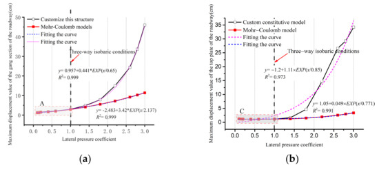 - With the change in the lateral pressure coefficient of the surrounding rock, the trend of deformation calculated by the Mohr–Coulomb model and custom constitutive model is basically the same, but the difference in the deformation amount is significant. The deformation of the Mohr–Coulomb constitutive model is significantly smaller than that of the custom constitutive model. The maximum displacement of surrounding rock follows an exponential trend with the variation in a lateral pressure coefficient.