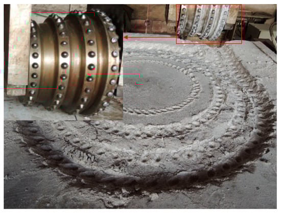 The safe disposal of high-level radioactive waste (HLW) is a significant topic and a challenging task for all countries utilizing nuclear energy. Deep geological disposal has been proposed as an appropriate method for dealing with HLW internationally. Its fundamental strategy is to deposit HLW in deep disposal pits after solidification and canning until its danger is reduced by radioactive decay to the point where there is no significant risk to humans or the environment []. Because of its high construction quality and low disturbance to the surrounding rock mass, mechanical excavation was commonly used to construct the disposal pit [,]. Due to the limited diameter of the shaft pit, the thrust per cutter provided by the excavation equipment is much lower than that of the usual tunnel boring machines (TBMs). Compared to disc cutters with the same diameter, button cutters that required less thrust for rock cutting are widely used as cutting tools for disposal pit excavation. It begins with the indentation of carbide buttons in the rock and progresses to the interaction between adjacent buttons [,], as shown in Figure 1. Thus, the structural parameters and arrangement of carbide buttons have a great influence on the rock breaking efficiency. Up to now, the influence of geometrical parameters of carbide buttons on rock breaking mechanisms is still an unresolved topic.