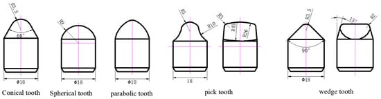Five types of commonly used carbide buttons, including conical, spherical, parabolic, saddle, and wedge buttons, will be investigated in this work. Figure 2 shows the structural parameters of these five carbide buttons. These buttons have the same diameter of 18 mm. The rock sample is granite in Beishan, Gansu Province.