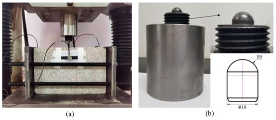 In order to verify the reliability of numerical simulation of rock indentation, an indentation test by the spherical carbide button was conducted. An electro-hydraulic servo universal testing machine with a maximum axial force of 1000 kN was used to load the axial force in the indentation test. A robust bearing platform and sample fixer were used to fix the rock sample and locate the indentation position, as shown in Figure 5. The loading force and displacement curves can be automatically obtained. After the indentation test, the fluorescent crack visualization method was employed to observe the crack pattern under the carbide button.
