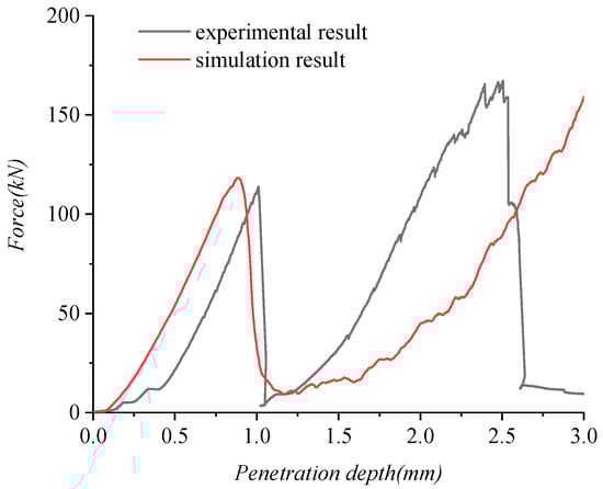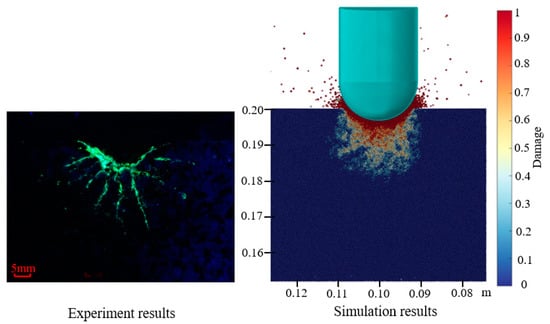 The curves of indentation force changed with penetration depth obtained from the simulation and experiment are shown in Figure 6. It can be seen that the trends of these two curves were extremely similar. The first force peak of both curves occurred at a penetration depth of about 1 mm, and the values were almost identical. Figure 7 depicts the crack pattern of rock penetrated by a spherical button at the penetration depth of 3 mm. The experimental results showed that several equal-length radial cracks distributed uniformly around the indenter. Similarly, numerical simulations also exhibited similar crack patterns and damage ranges. Thus, the numerical simulation results were in agreement with the experimental findings. It can be concluded that the numerical simulation was reliable to predict the penetration force and simulate the rock damage mechanism, and can be further used to study other types of buttons.
