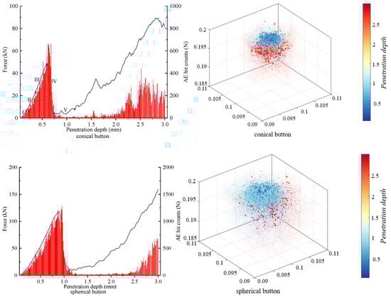 The force–penetration depth curves and acoustic emission (AE) events caused by five types of carbide buttons are depicted in Figure 8. In the spatial distribution graph of the AE events, the size of points represents their energy magnitude, while the color indicates the penetration depth at which they formed. The force–penetration depth curves for all five buttons exhibited a consistent trend of multiple loading–unloading cycles. During each loading–unloading cycle, the number of AE events gradually increased and reached a peak when the peak force suddenly decreased. Take the conical button as an example. The indentation force gradually increased as the penetration depth increased during stage I. It corresponded with the closure of pre-existing microflaws, and only a few AE events were detected. In stage II, the indentation force increased approximately linearly with the penetration depth. The number of AE events also increased gradually, mainly resulting in microcracks. The rock deformed in an elastic–plastic manner. In stage III, the indentation force increased nonlinearly with the increase of penetration depth, indicating that the rock exhibited anisotropic characteristics. The indentation force fluctuated until it reached the peak value, and the rock was severely damaged. During this stage, a large number of AE events were generated. Subsequently, the indentation force dropped sharply and entered unloading stage IV, accompanied by a large number of AE events. The particles at the contact between the button and the rock were completely destroyed, forming a crushed zone. When reaching stage V, the load transfer capacity of the crushed zone was almost zero, and the indentation force increased very slowly until the rock was recompacted and entered a new loading and unloading cycle. Due to the loss of symmetry in the stress distribution under the carbide button after the rock was damaged, the fluctuation of indentation force was more obvious in the new cycle. The peak forces of the saddle, spherical, wedge, parabolic, and conical buttons were 135, 118, 116, 53, and 49 kN, respectively. This indicated that the saddle button required the maximum thrust provided by the equipment during rock breaking.