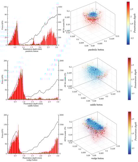 The contact between conical, spherical, and parabolic buttons and rocks is point contact. They have the same AE event distribution pattern, i.e., a hemispherical high-density AE event aggregation zone was formed beneath the button during the first loading and unloading cycle. New AE events subsequently occurred uniformly outside the zone as the carbide buttons continued to penetrate into the rock. Among these three buttons, the spherical button produced the largest AE zone range and most AE events during the first loading and unloading cycle. This is because its profile has the largest curvature, which allows it to penetrate the largest volume at the same depth. The contact between the wedge button and the rock can be described in a linear manner. AE events first occurred at the chamfers on both ends of the button, and a slit-shaped high-density AE events aggregation zone was formed beneath the wedge button during the first loading and unloading cycle. New AE events in the following loading cycles mainly occurred beneath the zone. For the saddle button, its contact with the rock started at point contact and gradually transformed into an arc-shaped line contact as the penetration depth increased. AE events first occurred at the contact point between the saddle button and the rock, and a slit-shaped high-density AE events aggregation zone was formed beneath the saddle button in the first cycle. Different from other buttons, new AE events mainly occurred at both ends of the slit-shaped AE zone.
