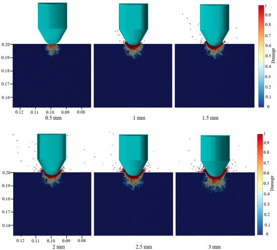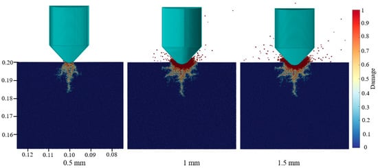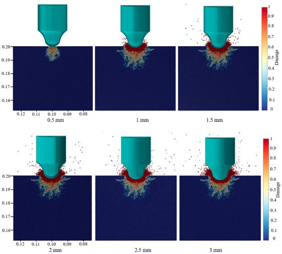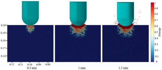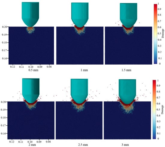 Figure 9, Figure 10, Figure 11, Figure 12 and Figure 13 depict the crack propagation patterns formed by five carbide buttons at various penetration depths. When the penetration depth was 0.5 mm, the rock failure mainly occurred directly beneath the carbide button, forming a crushed zone, but the number of cracks was relatively small. As the penetration depth increased, the dense crushed zone transferred energy to the hemispherical plastic failure zone, resulting in a large number of cracks at the penetration depth of 1 mm. There are more tensile cracks than shear cracks, indicating that tensile failure dominates the rock damage. As the penetration depth further increased, the trend of increasing the failure zone slowed down, but the cracks still had some extension.