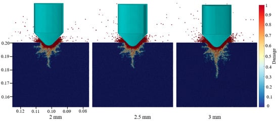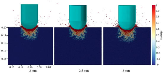 Only a few researchers have used the three-dimensional discrete element method to investigate the rock breaking mechanism of cutters and validated the simulation results with laboratory tests [,,,,]. Xue et al. [] constructed a large 3D model of cutter rock fragmentation to simulate the actual rock breaking process of cutters using the MatDEM software. Ucgul et al. [] simulated the interaction between soil and different structure parameters of sweep tillage tools using DEM, and found that structure parameters had major effects on tillage forces and soil movement for shallow working. When using DEM to simulate 3D rock cutting, the increase in model dimensions and degrees of freedom leads to greater computational demand for numerical simulation []. Thus, researchers have to sacrifice model element resolution to achieve reasonable simulation time; that is, the particle radius in the existing 3D simulations mainly ranged from 1.3 and 6.0 mm. Due to the small contact area between the carbide button and the rock, the difference in the indenter profiles cannot be accurately characterized. In addition, the 3D crack propagation patterns in the rock breaking process cannot be observed explicitly.