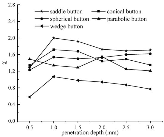 The ratio of crack width to depth χ with penetration depth is shown in Figure 15. Except for the parabolic button, all buttons generated the largest χ at or near the penetration depth of 1 mm, consistent with the penetration depth corresponding to the first peak force. The saddle button had the largest χ, while the wedge button had the smallest χ. This indicates that the saddle button is more prone to produce lateral cracks while the wedge button is more prone to produce vertical cracks. Therefore, the wedge button is not suitable for the Beishan granite, while the saddle button has the greatest rock breaking potential.