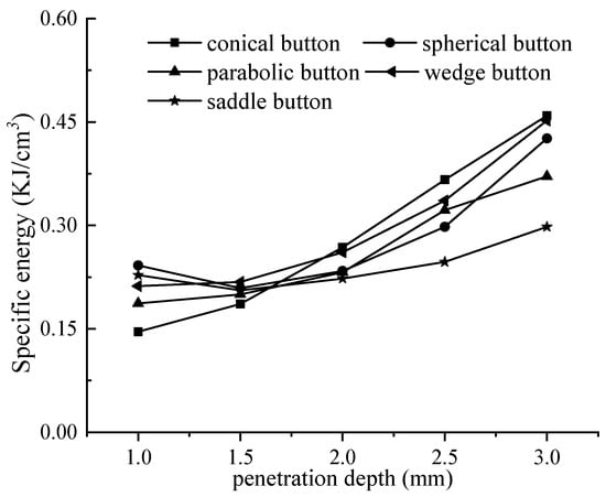 The specific energy values of five carbide buttons at different penetration depths are shown in Figure 16. When the penetration was 0.5 mm, there were almost no rock fragments generated beneath the carbide button, so the specific energy was not calculated. The values with conical buttons were smaller when the penetration depth was less than or equal to 1.5 mm. The value of the saddle button decreased as the penetration depth increased. The research results showed that the carbide button and the saddle button are the best choices as the button cutter’s penetration depth varies.