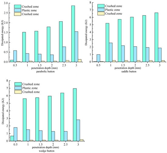 Previous studies have rarely analyzed the distribution of energy consumption during three-dimensional rock breaking processes. The proportion of energy consumption distribution in the crushed, plastic, and main cracked zones can reflect the rock breaking efficiency of carbide buttons. The higher proportion of energy consumption in the crushed zone, the lower the energy consumption used to generate cracks, and the lower the rock breaking potential of the carbide button. The distribution of dissipated energy in three damaged zones under these five buttons at various penetration depths is depicted in Figure 17. It was found that the energy consumption in the crushed zone of carbide buttons cutting rock was around 67~76%, and that in the plastic zone was between 17~21%, while that for crack propagation was only less than 4~6%. The spherical and saddle buttons consumed the least energy in the crushed area, indicating better energy utilization and distribution. Because these two carbide buttons had a larger contact area with rocks, the range of the crushed zone generated was also larger, resulting in an increase in the contact area between the crushed and plastic zones, which could transfer more energy to the plastic zone and generate more cracks.