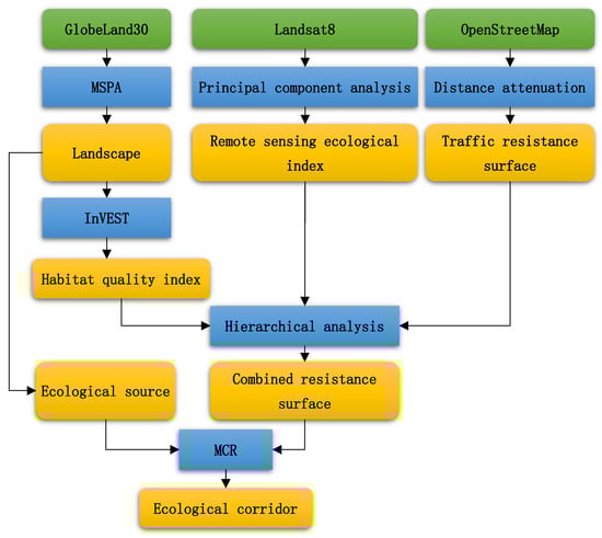 Our research includes the following two steps. Firstly, we completed the collection and pre-processing of basic data. Secondly, ecological corridors were extracted separately using the before-and-after optimization method, and separate preliminary analyses were conducted.