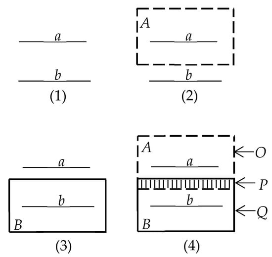 As shown in Figure 2, a and b are two roads, and the thick boxes A (dashed line) and B (solid line) correspond to the impact areas of a and b, respectively. The figure contains the following elements:, (1) spatial distribution of road a, b; (2) impact region of road a; (3) impact region of road b; (4) superimposed impact region of roads a and b, divided into three regions (O, P, Q) from top to bottom, impact region (O) of road a, common impact region of roads a and b (the middle short vertical line covering the region P), and impact region (Q) of road b. The influence degree of region P is the cumulative amount of a and b influence values, and this calculation method is applicable to the spatial propagation of noise, dust, lighting, and other influence factors. For a single road, the closer to the road, the greater the impact, and then as the distance between roads gradually increases, the impact gradually decreases until it disappears. As an extreme example, if road a can only be passed during the day, road b can only be passed at night, and the sound of vehicles moving can only be heard in region O during the day and in region Q at night, while noise can be heard in region P throughout the day. This superimposed effect must be noted.