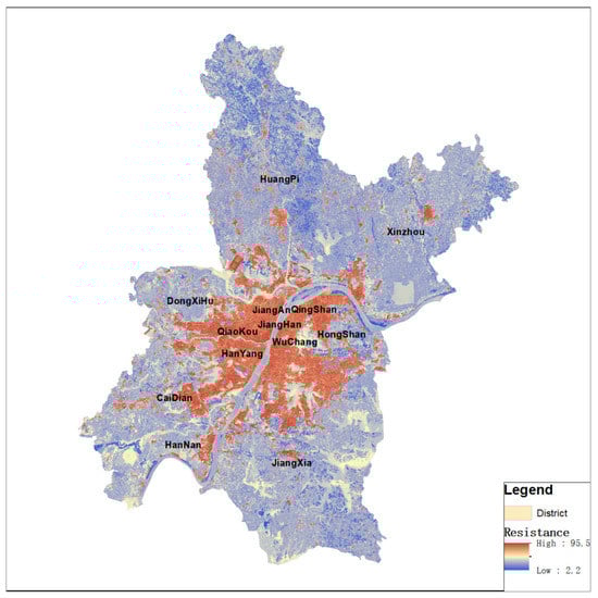 First, the GlobeLand30, Landsat8 L2, and OpenStreetMap road network data are analyzed and calculated using the method in Section 2.2 to obtain information on the landscape, habitat quality, remote sensing ecology, and road traffic resistance in Wuhan. Then, the combined resistance is calculated using the weights and resistance values in Table 1 and the method in Section 2.2.3. The calculation results of the combined resistance are detailed in Figure 4, where the resistance values gradually increase from blue to red. In the central city of Wuhan, the combined resistance is larger, and the further the distance away from the city center, the smaller the resistance value becomes. However, there is a general abrupt change in the resistance values, mainly due to the abrupt change from the artificial surface to the natural surface, and the ecological resistance values of these two surfaces differ greatly.