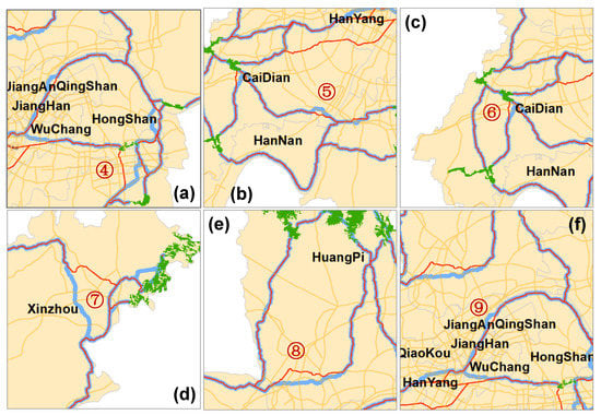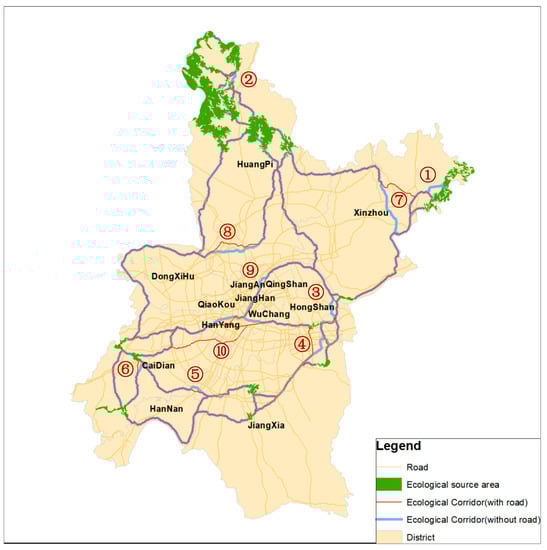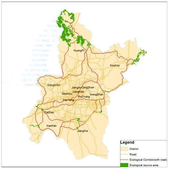 Using the method in Section 2.1 to analyze and calculate the GlobeLand30 data, we extracted the ecological source areas of Wuhan, as shown in the green areas in Figure 5. We can see that the ecological source areas are mainly distributed in the peripheral areas of Wuhan, especially in the northern and northeastern mountainous areas, and the ecological source areas consist of multiple plots with large areas and concentrated distribution. The ecological source areas in the central and southern areas are smaller in area and sporadically distributed.