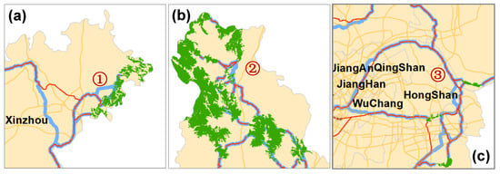 Wuhan, which is in the province of Hubei, is selected as the study area. Located in the middle reaches of the Yangtze River, Wuhan is the capital of Hubei Province and a megacity in central China, as well as an important transportation hub in the central region. The Yangtze River and the Han River meet in Wuhan and divide it into three, forming the towns of Wuchang, Hankou, and Hanyang. Wuhan has a large population and an urbanization rate of 80.2%. According to different development directions and resource distribution, Wuhan is divided into one central district and six suburban districts. The suburbs include Huangpi District, East–West Lake District, Caidian District, Jiangxia District, Hannan District, and Xinzhou District. Due to the implementation of the “Rise of Central China” strategy, Wuhan is experiencing rapid urbanization, which has brought great pressure on the ecological landscape construction in Wuhan.