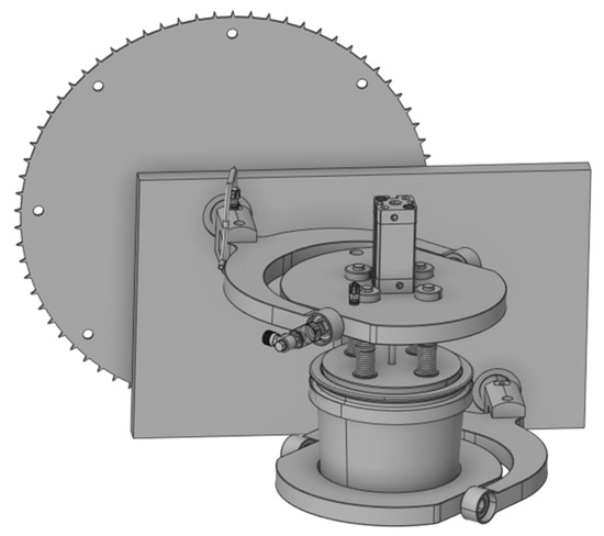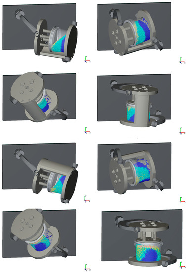 The Turbula® movement is a three-dimensional movement based on the Schatz six-revolute mechanism [19], which has been employed to mixing powders. To replicate this movement, which was analysed in [20,21], an FEM model from the mixer geometry was created, and the parameterized position of every part during a cycle of movement was obtained by a rigid dynamics analysis. These position data were imported to the DEM software and applied to the DEM model. The movement described by the mixer model in each cycle is shown in Figure 3, representing the position of it every 45°.