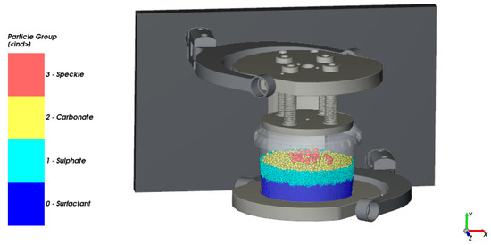 From the geometry of the 3D mixer, only the parts that affect the mixing process were included in the DEM model. To model the powder components, spherical particles were used, and the liquid component was modelled as a liquid film added to the particles, and the liquid amount added to each particle can change when particles interact between them. Due to the particle size of the different components, the modelling of the mixture was expected to generate a high number of particles with a high computational cost. Thus, the Same Statistic Weight (SSW) method has been considered, according to [17], by which a scale factor is applied to the particle size of all the components, achieving a reduction in the particle number to be modelled but keeping the initial shape of the particle size distribution. Table 2 indicates the particle size of every component used in the DEM model, as well as the percentage by mass according to a standard formulation. The mechanical properties regarding interactions between particles, and between particles and boundaries, are presented in Table 3. The DEM model at the initial stage of the mixing process is shown in Figure 2, where a certain colour is assigned to every component. Initially, the powder components were totally segregated, and it was considered that the liquid component mass was equally distributed between particles of surfactant component.