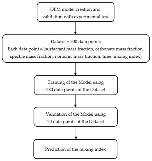Figure 4 shows the flowchart of the methodology defined to predict the mixing index of the mixing process. The DEM model created is used to obtain the dataset. According the 25 design points listed in Table 4 and considering a time every 5 s from 5 to 60 s, a dataset of 300 data points was created. Each data point is composed by values of the inputs and the output. For the predictive model, the inputs are time and mass fraction of surfactant, carbonate, speckle and nonionic, and the output is the mixing index. The sulphate mass fraction is not considered an input because it depends on the total amount of the other components.