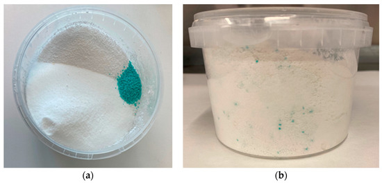 Mixing test. (a) Initial filling of the components in the cup; (b) mixture of the components after the mixing process.