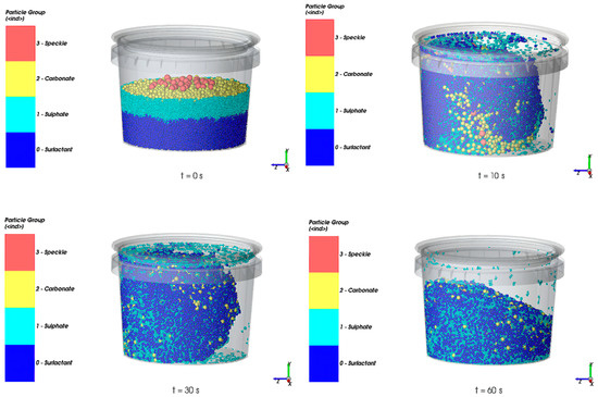 Every design point was simulated using the DEM model for a total mixing time of 60 s. The evolution of the mixture in the cup from the initial to the final instant of the process for the first design point is shown in Figure 8, where each represented instant matches with the end of a cycle of the mixer. A uniform mixing of particles is observed at 60 s from a visual point of view.