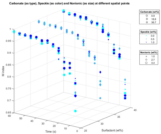 A 6D scatter plot of the M index depending on the inputs surfactant, carbonate, speckle, nonionic and time.