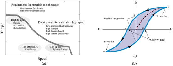 (a) Demands of core materials on an electric vehicle motor’s applications, reprinted/adapted with permission from []; and (b) Magnetic flux density B against the magnetizing force H (B-H) curve with some critical points.