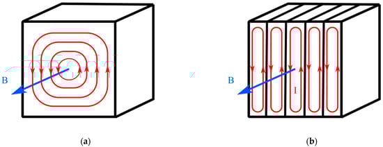 In studies addressing the magnetic properties of NGO electrical steels, core loss, coercive field, permeability, and magnetic induction are the main properties that dictate the magnetic material behavior. The important properties of electrical steel differ for alternating current (AC) and direct current (DC). For AC applications, core loss is of major importance, because the alternating nature of AC causes very rapid domain flipping, and thus hysteresis loss of the core loss becomes a larger component of the energy loss []. In contrast, permeability, coercive field, and magnetic induction properties are more important in applications under DC conditions. Hysteresis loss also occurs in applications under DC conditions; however, it is not the main influence on energy loss [].