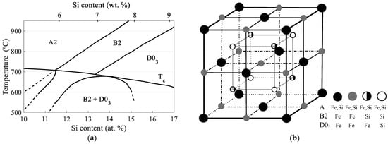 (a) Section of the binary phase diagram of the Fe-Si alloy system []. (b) Superlattice structures of A2, B2, and D03 structures in high Si electrical steels. A2 is disordered, allowing Fe and Si to allocate in any available site. In B2 ordering, solid gray and black dots represent the sites where Fe is present, whereas gradient and open dots represent the sites where Si is observed. In the D03 texture, open dots represent the sites where Si is located, while Fe were located on other sites [].