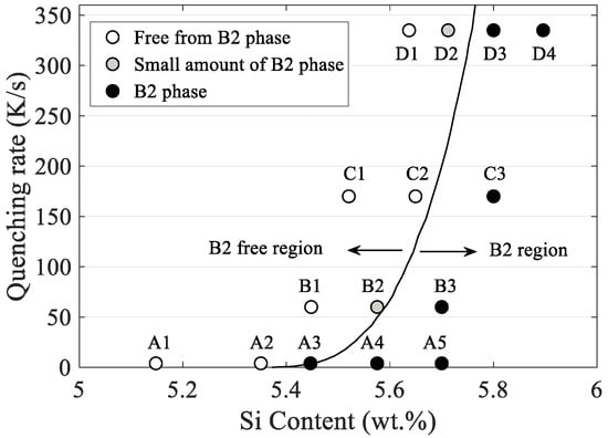 Si content with respect to critical cooling rates. The samples were annealed at 850 °C for 1 h, and then quenched at different cooling rates [].
