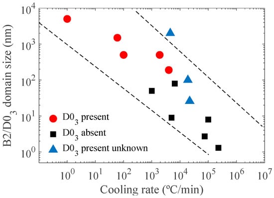 Rapid cooling at a critical cooling rate can suppress D03 ordering and reduce the size of B2 ordering in Fe-Si alloys []. An exponential relationship between the Si content and the critical cooling rate can be observed in Figure 4 where A1 to A5 are air quenched, B1 to B3 are oil quenched, C1 to C3 water quenched, and D1 to D4 are brine quenched. In another study, 5–6 wt.% Si 2 mm thick strip samples were hot-rolled at 1200–900 °C and cooled by air. The strip samples were then annealed at 850 °C for 1 h and cooled at different cooling rates (as shown in Figure 5). As seen in this figure, the high cooling rate can reduce the domain size of B2 phase and suppress the D03 phase []. In addition, deformation decreases high Si ordering and reduces brittleness [].