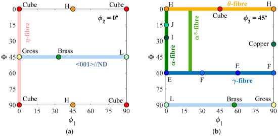 Fiber structures and orientations in electrical steels (Bunge notation) at: (a) φ2 = 0° section, and (b) φ2 = 45° section.