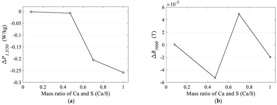 Ca additions have also been used to decrease the number of small MnS particles. A 3.2 wt.% Si + 0.4 wt.% Al steel was 1-stage cold-rolled to 0.5 mm, and finally annealed at 900 °C. The effects of Ca on the core loss are illustrated in Figure 7 [].