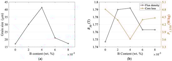 The influence of B content in NGO electrical steels is correlated to the Al and nitrogen content. Lyudkovksy reported that over the composition range of 0.033–0.053 wt.% Al, the addition of 0.0007–0.0038 wt.% B could lead to BN precipitation instead of AlN []. This may increase the grain size and lead to an ideal texture. In the range of 0.0075–0.053 wt.% B content for Fe-6.5 wt.% electrical steels, Kim observed that an increase of B content might also have a grain-refining effect, and also improve bending strength and ductility at room temperature []. The influence of B in Fe-1.35 wt.% electrical steels has also been studied [], as illustrated in Figure 9. As shown in Figure 9a, with the increase of B content up to 0.004 wt.%, the grain size increased. When the B content is higher than 0.004 wt.%, the correlation is inverted []. As shown in Figure 9b, the correlation between core loss, flux density, and B content also changed at 0.004 wt.% B content. The best magnetic properties were achieved with 0.004 wt.% B content, with core loss 3.616 W/kg and magnetic induction 1.792 T [].