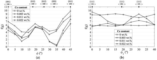 Effect of Cerium (Ce) on the intensity of (a) <100>//RD texture, and (b) <111>//ND texture. Hot-rolling finishing temperature: 890 °C; and hot band annealing temperature: 700 °C [].
