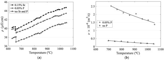 (a) Electrical resistivity and (b) dynamic viscosity of the metal at higher temperatures with and without phosphorus [].