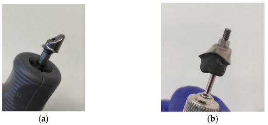 The samples were stored in distilled water at 37 °C for a period of 24 h prior to testing. The implants were fixed in the holder of the fatigue testing machine immersed in polymethyl methacrylate. The samples were subjected to dynamic load in a computer-controlled 2-axis machine that simulated masticatory movements, Chewing Simulator CS-4 (SD-Mechatronik, Westerham, Germany) (Figure 5), for 250,000 cycles, representing 1 year of clinical operation of the superstructures, at a frequency of 2 Hz.