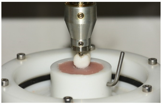 A load of a 300 N force was applied using a standardized steel antagonist with a cone shape and 30° wall inclination, which contacted the sample at the central fissure. The vertical impact was applied according to the manufacturer’s recommendations (refer to the manufacturer): upward direction, 2 mm; downward direction, 2.5 mm; upward speed, 60 mm/s; downward speed, 20 mm/s; horizontal impact, 0 mm; and speed, 20 mm/s.