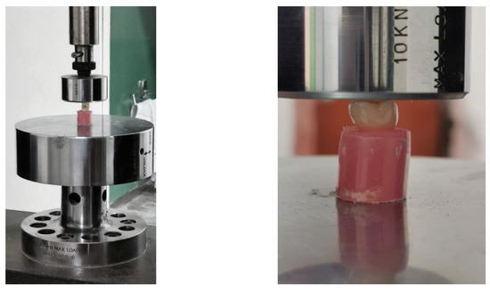 The samples were then subjected to compressive strength testing in an Instron M 1185 universal testing machine. A metal steel disc was used as an antagonist, exerting pressure at a rate of 2 mm/min at room temperature on each sample. The force was applied until the sample was completely destroyed (Figure 6). The data were then tabulated using Instrument Explorer software and were subject to descriptive analysis and t-testing. Each sample was examined in detail under a microscope, and an examination of the type of fracture was carried out.