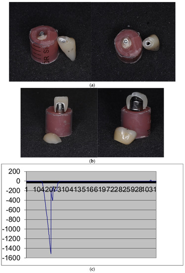 The sintering of the lithium disilicate monolithic crowns was performed in a Programat P300 furnace (Ivoclar Vivadent, Shaan, Liechtenstein), and that of the zirconium crowns in a Zirconmaster S furnace (VOP Ltd., Sofia, Bulgaria), followed by glazing. The cementation of the monolithic crowns in the Group A and C abutments was performed according to the manufacturer’s instructions for lithium disilicate. Each sample was screw-retained over the implant and retightened after 10 min to avoid the possibility of its loosening.