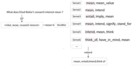 where aj represents the j-th word (an entity, relationship, or concept vocabulary) that needs to be expanded, Sense_set is the set of expanded vocabulary, n represents all semantics, k represents a certain semantics, and getSense (i, aj) represents the result of aj expansion under i-th semantics. This formula means that under certain semantics, all of the entities and relations’ words are semantically expanded, and the semantics and all the expansion results before the semantics are added as the final expansion result. For example, if the word mean is expanded, there are 10 semantic dimensions (n = 10). If Sense5 is selected as the semantic expansion dimension (k = 5), the final expansion result should be the sum of the expansion results of Sense1–Sense5.