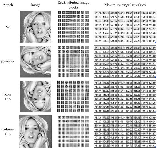 If the absolute value of N2 is more than N3 in Equation (15), matrix B is left unchanged; otherwise, the transpose of B is taken to obtain the normalized image. Image B is divided into square blocks of size 2n (n = 1, 2, 3…│2n < m/2) (in this study, n = 2), which are represented by Bi,j (i = 1, 2,…, m/4; j = 1, 2,…, m/4). The largest singular value σmax of each image block is calculated using the matrix 2-norm given in Equation (4) in the spatial domain instead of utilizing the SVD transform. Figure 3 provides an illustration of the concept described above using the example of a square image with dimensions of 32 by 32 pixels, which has been split into blocks with dimensions of 4 by 4 pixels. It is evident from the figure that the largest singular value of the image blocks remains the same under different attacks.