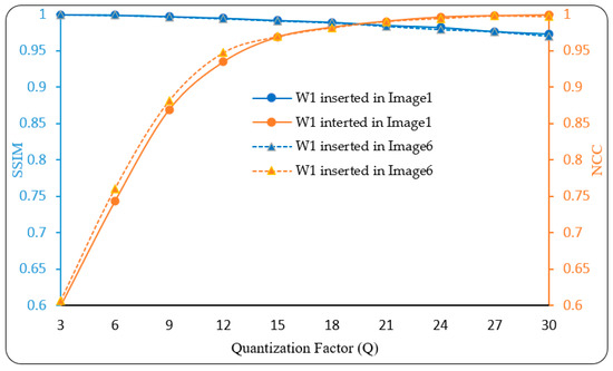 The watermark imperceptibility and robustness are two characteristics of a watermarking algorithm that are mutually exclusive and connected. In the proposed watermarking scheme, these properties are balanced using quantization factor ‘Q’. A smaller value of Q will implant less information into the host image, resulting in a small decrease in the visual quality; however, this information may be easily deleted using basic modification techniques. Although a greater value of Q will implant more information into the host image, resulting in a significant decrease in the visual quality, this information cannot be simply removed using basic modification techniques. Thus, a lower Q favors imperceptibility, and a higher value favors robustness. Finding the appropriate value for this parameter is a very important and challenging task. A sensitivity analysis of Q is performed using several images and watermarks to resolve the trade-off between the robustness and imperceptibility of the proposed watermarking approach. The NCC and SSIM values are computed to represent robustness and imperceptibility, respectively. On the basis of these assessment metrics, the value of Q of the proposed scheme is nearly the same for each image, with minor variations. Some results are given in Figure 6, where a watermark (W1) was embedded into the host image1 and image1 by taking different quantization factor ‘Q’, and the associated NCC and SSIM values were calculated. In the graph of these NCC and SSIM values, it can be seen that Q = 20 was a suitable choice, which was considered in further calculations.