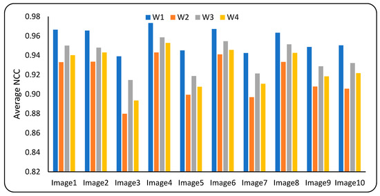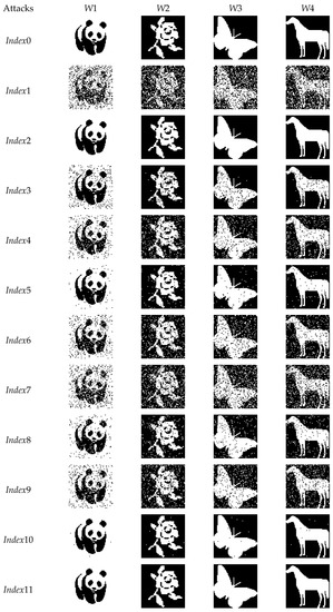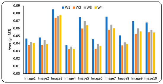 This section analyzes the robustness of the proposed watermarking scheme, utilizing image distortion attacks to distort the watermarked image shown in Table 1 and the extraction procedure described in Section 3.3. The normalized correlation coefficient (NCC) and bits error ratio (BER), which are defined in Equations (25) and (26), were employed for this task. A higher NCC value means higher robustness, while a smaller BER value means higher robustness. Therefore, BER and NCC values approaching zero and one, respectively, indicate that the embedded and extracted watermarks are almost the same. The NCC and BER values of the extracted watermarks corresponding to inserted watermarks W1 to W4 are given in Table 3, Table 4 and Table 5. To investigate the collective robustness of the proposed scheme, the average NCC and SSIM of all the attacks of the extracted watermarks corresponding to each image are given in Table 3. According to the table, the proposed watermarking scheme was resistant to all distortion attacks with NCC values close to 1 and BER values close to 0. Figure 7 and Figure 8 demonstrate the same phenomenon, representing the average NCC and the average BER, respectively. To investigate the robustness of the proposed scheme against each image manipulation attack, the average NCC and BER values of all extracted watermarks for each image are given in Table 4 and Table 5, respectively. The proposed watermarking scheme’s ability to retrieve the watermarks exactly as they were inserted is demonstrated by the NCC values of 1 and BER values of 0 in the cases of 90-degree rotation and row and column flipping (index2, index11, and index12). The outcome of the research comes close to fulfilling the objectives of the study. Due to space constraints, the extracted watermarks only from ‘image1’ are given in Figure 9. The figure demonstrates that the recovered watermarks by the proposed scheme were almost similar to the embedded watermark in every instance. Except in a few cases, the extracted watermark may be recognized with the naked eye. The extracted watermarks in the cases of attack indices 1, 6, 7, 8, 9, and 13 have poor quality in comparison to the other cases. Further improvement of the watermarking scheme is needed considering these cases.