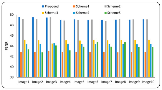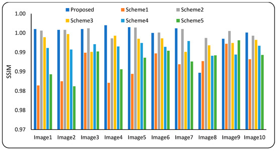 This section compares the proposed watermarking scheme with other related watermarking schemes, as presented by Parah et al. [48], Zhang et al. [49], Zeng et al. [50], Su et al. [47], and Elbasi et al. [26]. The schemes selected for the comparison in this study are denoted by scheme1, scheme2, scheme3, scheme4, and scheme5 respectively in Figure 10, Figure 11, Figure 12 and Figure 13. The reason behind the selection of the schemes is that all these schemes have, in some way or another, utilized an idea that is similar to the proposed scheme. The imperceptibility of the schemes was compared by calculating the average of the imperceptibility measurements of all watermarks for each host image, and the findings are shown in Figure 10 and Figure 11 with the help of bar charts. From these Figures, it can be observed that the PSNR and SSIM values achieved by the proposed watermarking approach are relatively better than those achieved by the other approaches in most cases. The scheme proposed by Zhang et al. [49] is second best in terms of imperceptibility. The proposed scheme’s average PSNR and SSIM are also greater than those of competing schemes.