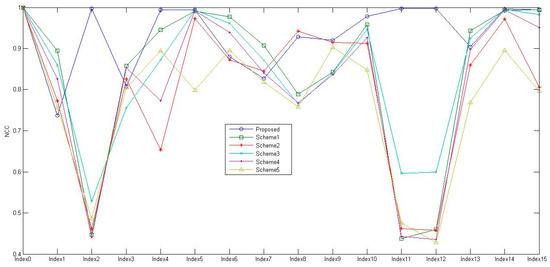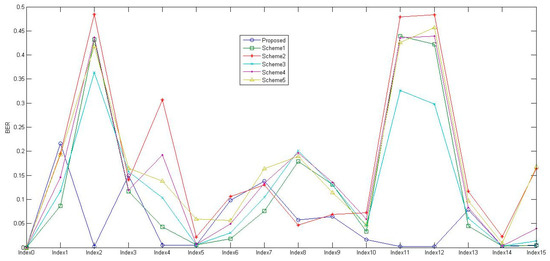To evaluate the robustness of the schemes, the average NCC values for all test images and all watermarks corresponding to each attack were calculated and are reported in Figure 12. The results of using a similar approach to determine the BER are shown in Figure 13. A close examination of these Figures reveals that, for attack indices 2, 11, and 12, which are rotation, row flipping, and column flipping, respectively, the performance of the other schemes is noticeably worse than the proposed scheme. The proposed watermarking scheme’s ability to retrieve the watermarks exactly as they were inserted is demonstrated by the NCC values of 1 and BER values of 0 in the cases of 90-degree rotation and row and column flipping (index2, index11, and index12). Similarly, in the other instances, the proposed scheme performed reasonably well compared to the alternative schemes. In a few instances, such as indices 1, 3, and 7, it did not perform as expected, requiring further investigation into the causes of its failure to meet expectations.