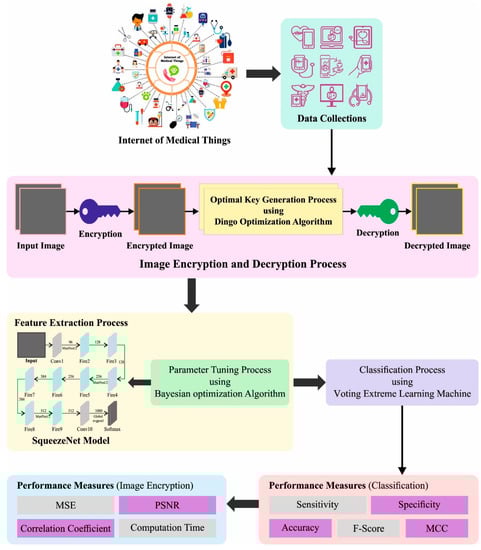 Deep learning (DL) related medical diagnosis in the IoMT signifies the use of machine learning (ML) and artificial intelligence (AI) approaches to examine medical datasets collected from different devices connected to the internet, namely medical equipment and wearable devices []. It enhances the precision level of diagnostic decisions, helps identify trends and patterns in patient data, and enables efficient and more personalized healthcare delivery []. Simultaneously, hyperparameter tuning of the DL models becomes essential to improve the overall classification performance. Since trial-and-error hyperparameter selection is a challenging task, metaheuristic optimization techniques are used. In addition, image encryption schemes can be used to securely transmit healthcare data in the IoMT encryption. Furthermore, the key generation process is critical to the security of an encryption algorithm, as the strength of the key directly impacts the security of the encrypted data. Therefore, it is important to use strong and secure key generation methods and to properly manage and protect the keys.