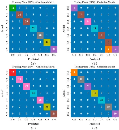 Confusion matrices of BSHS-EODL approach (a,b) TRS/TSS of 80:20 and (c,d) TRS/TSS of 70:30.