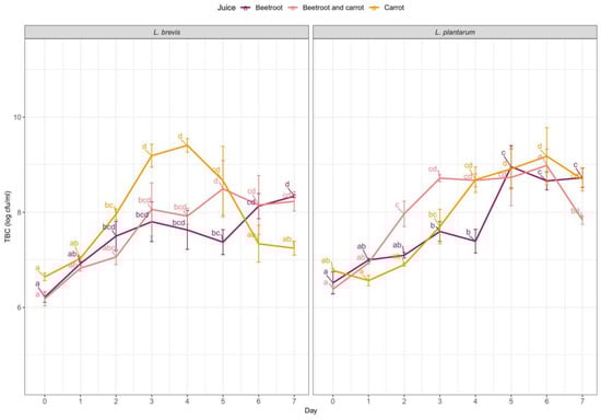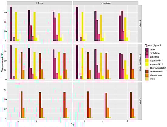 During the fermentation process, all juices experienced a decrease in pH values on the following day, regardless of the juice type or bacterial strain used (Figure 2). However, it is crucial to note that juices inoculated with L. plantarum experienced a faster decrease in pH values compared to those inoculated with L. brevis. The lowest pH level of 3.3 was recorded for beetroot juice fermented with L. plantarum after 7 days, while carrot juices exhibited higher pH values than beetroot juices or their mixture. It is important to understand that the pH value directly corresponds to the lactic acid content produced during the growth of the LAB. Our research aligns with the findings of Marszałek et al. [45] for fresh beetroot juices and the findings of Tanguler et al. [46] for carrot juice, where similar pH values were observed. Moreover, it is worth noting that Tanguler et al. [46] observed the same trend with pH and total acidity as we observed in our research.