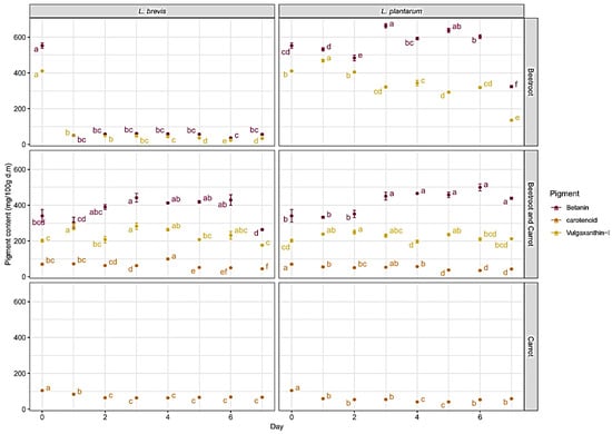 In the literature, pigments such as carotenoids and betalains are mentioned to be sensitive to low pH values. However, betalains show higher stability at low pH compared to carotenoids [4,37,49]. In the presented research, differentiation between lactic acid bacteria strains used on pigment behavior was observed. However, in all tested samples decreases in pigment values were observed.